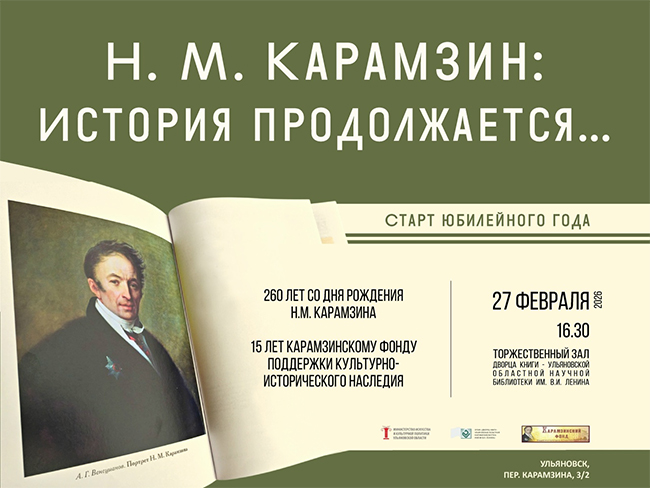 В Ульяновской области дали старт юбилейному году историографа Николая Карамзина02/03/2026Торжественное мероприятие состоялось 27 февраля во Дворце книги. В 2026 году историку, поэту, прозаику, публицисту и реформатору русского языка исполнится 260 лет. В регионе запланирована программа мероприятий, приуроченная к юбилейной дате.«Имя Николая Михайловича Карамзина тесно связано с Симбирским краем. Сегодня жители Ульяновской области гордятся своим выдающимся земляком. Памятник Николаю Ка… -
