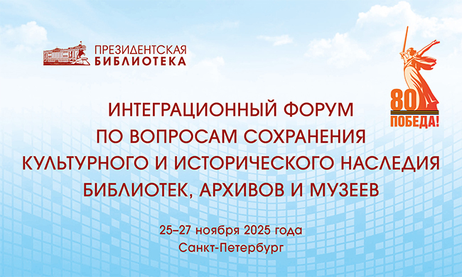 Ежегодный Интеграционный форум приурочат к 80-летию Победы в Великой Отечественной войне24/11/202525–27 ноября 2025 года Президентская библиотека Управления делами Президента Российской Федерации при поддержке Межгосударственного фонда гуманитарного сотрудничества государств-участников СНГ и Библиотечной Ассамблеи Евразии проводит Интеграционный форум по вопросам сохранения культурного и исторического наследия библиотек, архивов и музеев, приуроченный к 80-летию Победы в Великой Отечественной… -