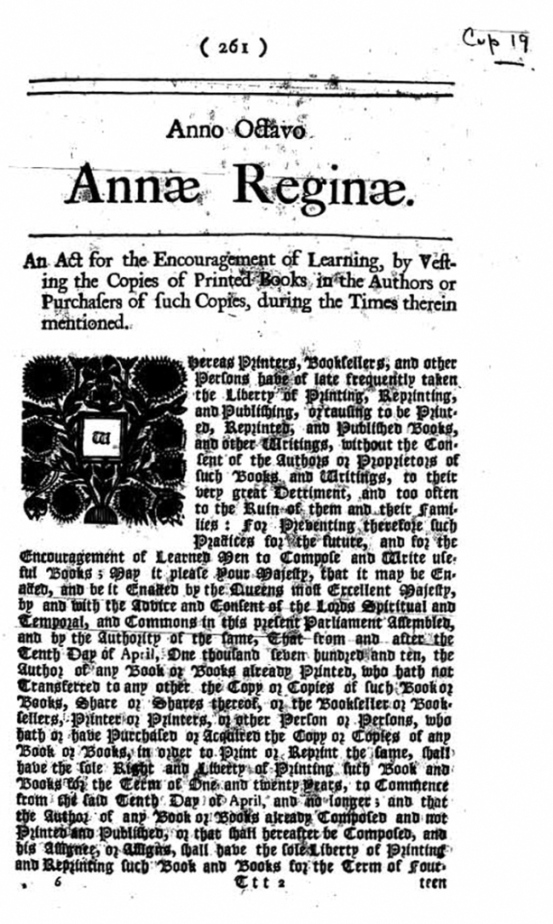 Упомянутый нами раннее первый в истории закон об авторском праве — «Статут королевы Анны» — предусматривал в качестве одной из формальностей, соблюдение которых предопределяло охрану исключительных прав, поставку девяти экземпляров произведения в различные университеты и библиотеки.
