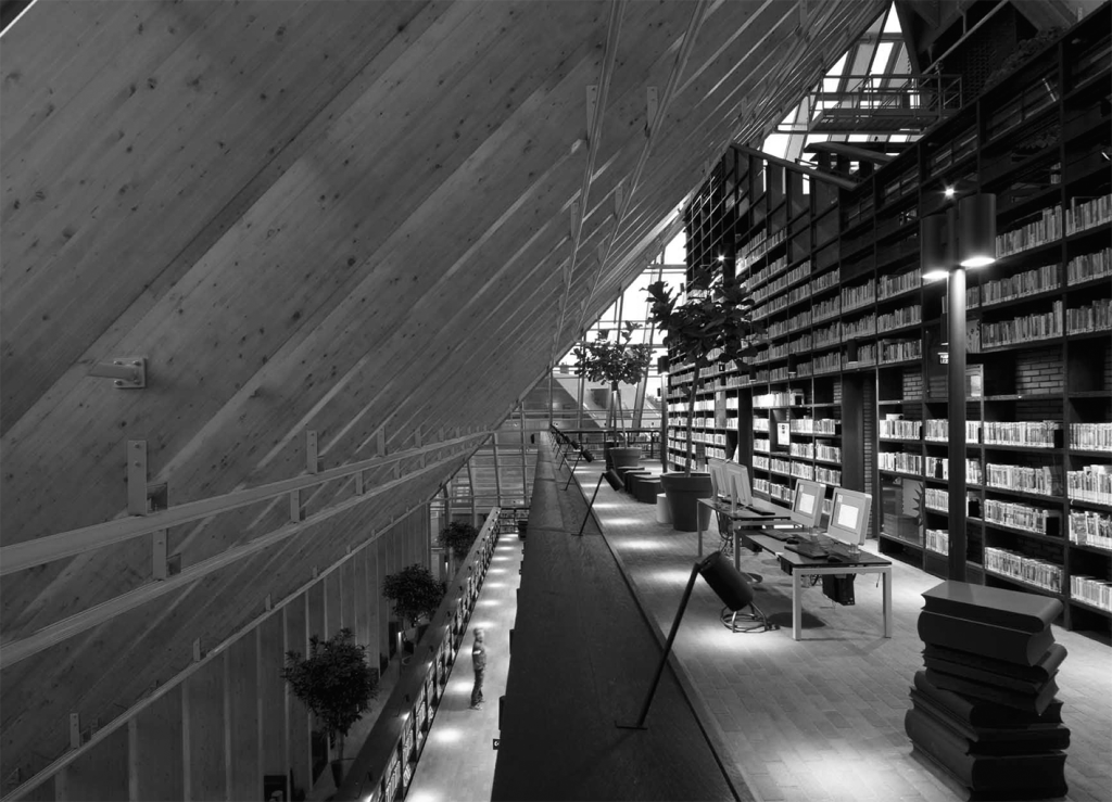 Площадь библиотеки 9300 м2. Фасады и перекрытия — стеклянные на деревянном каркасе. Ярусы связаны между собой лестницами, общая длина которых составляет чуть меньше пятисот метров. Форма и материалы отсылают к облику традиционной голландской фермы — прямоугольный кирпичный фундамент, большая покатая крыша, кирпичный дымоход.