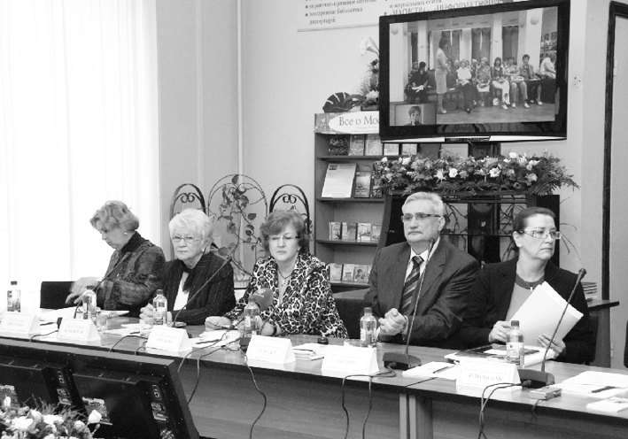 В президиуме сидят (слева направо): В. П. Викулова, директор ГБУК «Дом Н. В. Гоголя – мемориальный музей и научная библиотека», Москва; М. С. Бутковская, директор ЦБС «Кунцево», Москва; Г. А. Артёмова, заместитель руководителя Департамента финансов города Москвы; Е. В. Медведев, начальник Управления по вопросам культурной политики и координации деятельности учреждений культуры Департамента культуры города Москвы; О. В. Гришина, заместитель руководителя Департамента культуры города Москвы