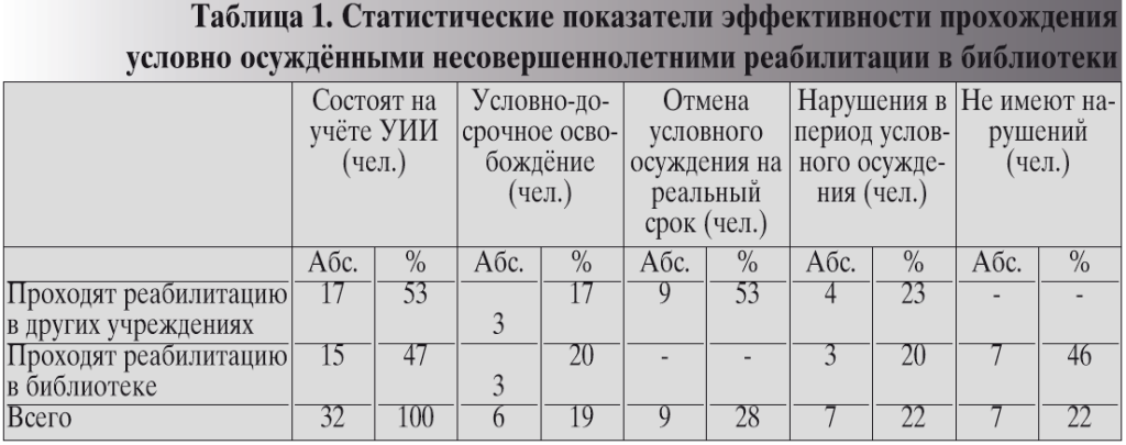 Активное участие несовершеннолетних в мероприятиях, организуемых в рамках сотрудничества уголовно-исполнительной инспекции и библиотеки, мотивирует несовершеннолетних на отмену условного осуждения с юридическим снятием судимости, и формирует у них установку на законопослушное поведение. Так, из 15 несовершеннолетних — 7 не имеют предупреждений и в отношении них может положительно решиться вопрос об отмене условного осуждения с юридическим снятием судимости.