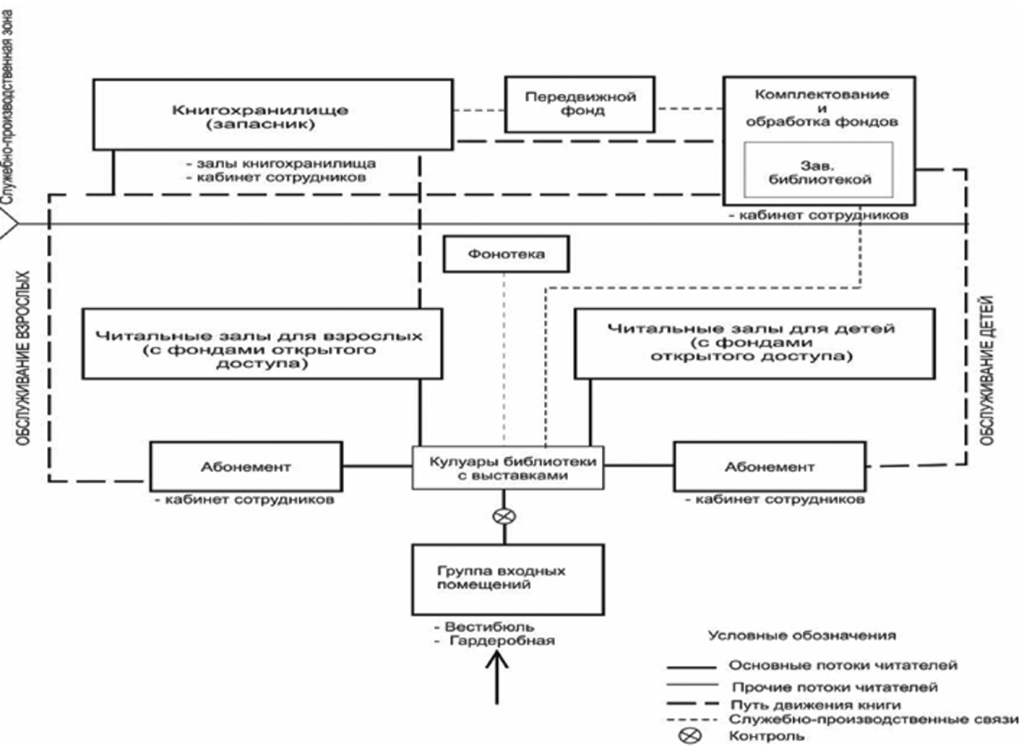 Библиотека — это «учреждение культуры, где собираются и хранятся фонды печатной продукции, производится её специальная обработка, распространение, организация использования в обществе».2 Реализация этих двух основных функций библиотеки (сбор и хранение документов и обеспечение доступа к фондам) происходит в определённой последовательности, то есть с соблюдением технологии. Архитектор создаёт материальные условия для применения этих технологий.
