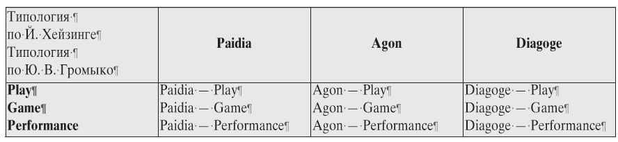 Признак цели лежит в основе типологии, предложенной Й. Хёйзингой, — культурологической триады игр. Её основные понятия: «paidia», «agon, «diagoge».** 4 В этой триаде отражено всё разнообразие целей функционеров. Различный характер правил и ограничений отражён в типологии, базирующейся на методологической триаде Ю. В. Громыко («play – game – performance»). В ней выделяют: спонтанное действие, при котором каждый следующий шаг участников непредсказуем («play»); действия по чётким правилам, где участники только воспроизводят заведённый ранее порядок («game»); игра творчества, поиска («performance»).