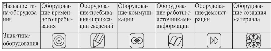 При описании технологии мы обнаружим, что все проводимые действия обеспечиваются определённым набором функциональных мест. Для выбранного типа игры существует свой перечень функциональных мест. Таковыми являются: место разработки темы; создания вспомогательных средств; информирования участников; опроса участников; выступления организаторов, свободной коммуникации участников; представления темы; размещения играющих (зрителей); организатора (специалиста, гостя); подготовки специалиста; представления; размещения дополнительного материала; доступа к ресурсам. Из описания действий, шагов и функциональных мест становится ясно, какие предметы, оборудование (их расположение и количество) нужны, какое пространство они будут занимать. Это задаёт характеристики помещений, требующихся для каждого отдельного шага и для игры в целом. Значения характеристик и диктуют требования к пространству игры. Пространство характеризуется следующими признаками: состав оборудования (оснащённость), величина помещения и возможность совмещения помещений. Оснащённость — характеристика внутренней организации пространства. С точки зрения оснащённости, все действия игры обеспечиваются ограниченным количеством наборов оборудования (табл. 2). Величина помещения — характеристика, задающая объём, габаритные размеры помещения. Она определяется необходимостью разместить определённое число участников как на каждом отдельном шаге игры, так и игры в целом. Может потребоваться пространство для одного человека; для небольшой группы (2–7 чел.); для группы (8–30 чел.); для массы людей (31–50 чел.) и для значительной массы людей (51–100 чел.). Возможность совмещения помещений — характеристика, задающая взаиморасположение помещений (зон помещений), предназначенных для различных действий игры. Она определяется тем, возможно ли на данном шаге игры совмещение разных действий в одном пространстве или нет.