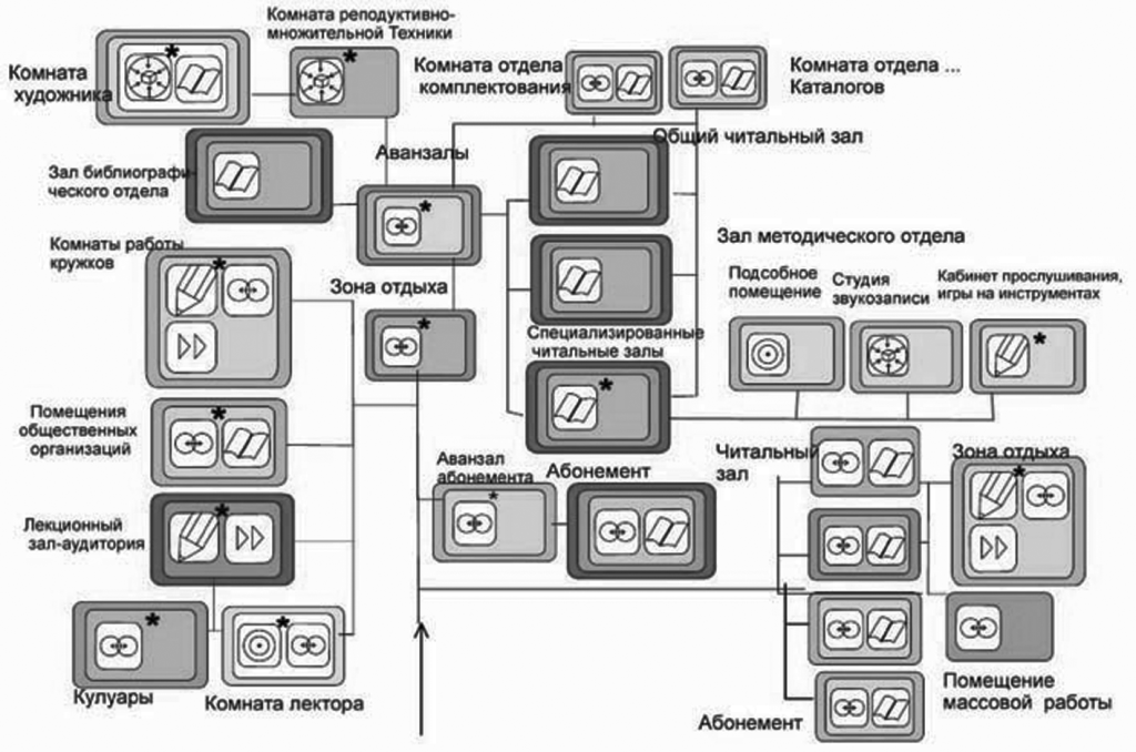 Для каждого типа библиотеки были составлены схемы взаимосвязи основных планировочных элементов. Такая схема была составлена, например, для небольших (IV тип) библиотек (схема 1).
