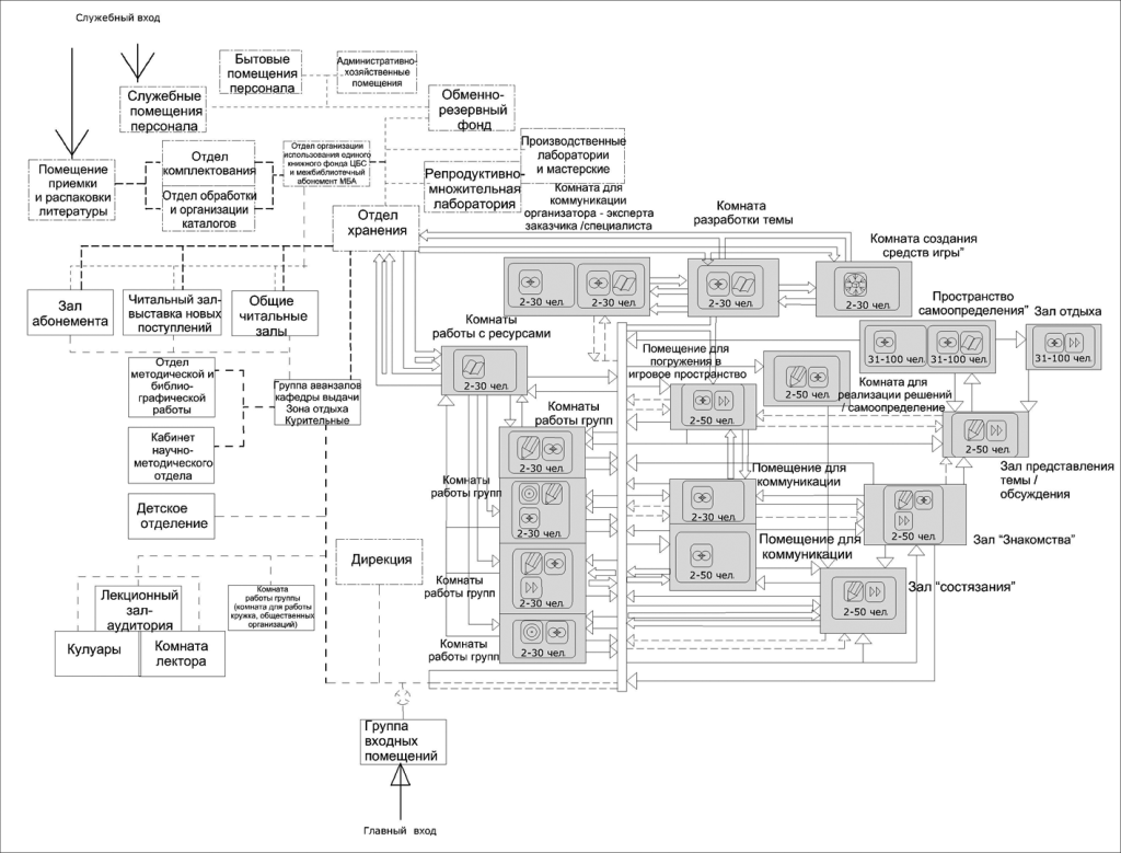 Оценивая возможности осуществления игровой деятельности в условиях нормативной функционально-планировочной организации библиотек, следует сказать, что заданная структура не позволяет полностью реализовывать технологию разных типов и форм игр. Это отражается в неполном составе требуемых помещений, в отсутствии прямого сообщения между некоторыми помещениями. При значительной реорганизации ряда помещений и упрощении технологии игр в нормативной структуре возможно проведение игровых действий ряда типов (paidia — game, paidia — performance, agon — game, agon — performance, diagoge — game, giagoge — performance). Но при этом количество участников ограничено, а предоставление других видов услуг затруднено. Однако существующие нормы обладают потенциальными возможностями и учитывают требования безопасности, от соблюдения которых нельзя отказаться. При условии детального представления технологии игровых действий разных типов можно предположить различные варианты изменения нормативных положений. В будущем это позволит шире использовать игры в библиотеках и повысит эффективность подобной формы работы с пользователями.