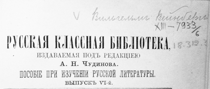 При окончательном разборе покупных библиотек осенью 1944 года12 в связи с их перемещением книги из этих собраний были промаркированы сотрудниками отдела комплектования, и теперь, встречая пометку «№11», проставленную в правом нижнем углу титульного листа, можно с большой долей вероятности утверждать, что эта книга поступила в РНБ из личной библиотеки В. В. Вейнберга. Сам владелец не всегда подписывал принадлежавшие ему книги. В настоящее время стараниями сотрудницы Русского запасного фонда, куда в своё время были направлены на хранение книги из поступлений военного времени, Ореховой И. О., выявлено около 60 книг из этой библиотеки. Основная часть материалов библиотеки — это книги по специальности владельца — медицине. Среди них много диссертаций, а также книги по истории медицины. Некоторые из них подарены владельцу коллегами по специальности. Среди авторов дарственных надписей — такие авторитетные учёные, доктора медицины, как Д. Д. Крылов13, Г. В. Миштовт14, К. В. Парский15, И. Я. Перельцвайг16.