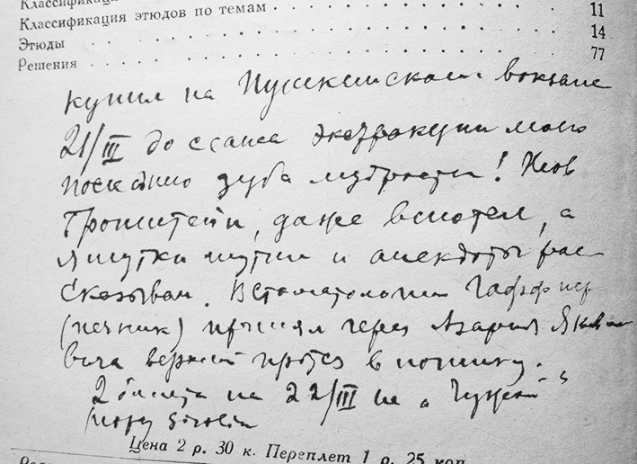 Пометы и записи владельца имеются во многих книгах, но наиболее изобилует ими сборник легендарного шахматиста Л. И. Куббеля21 «250 избранных этюдов» (М.-Л., 1938). Кроме владельческой записи «В. В. Вейнберг старший» и даты приобретения книги — «21/III — 39», на 2-й странице форзаца доктор Вейнберг записал свой адрес (Казначейская 1 кв. 15) и телефон (А–123–93), видимо, на случай потери книги. Рядом с владельческой записью сообщается: «О Корзуне Ефиме Карповиче 103 лет», и действительно, многие записи на полях издания посвящены записям бесед с этим человеком. Сведения о Е. К. Корзуне имеются в адресной и справочной книге на 1935 год: «Корзун Ефим Карпович. Гос. Консерватория. В. О. В. Слуцкой22, 70, кв. 35», и в списке сотрудников Консерватории, погибших в блокаду, он указан как настройщик. В 15 томе Блокадной Книги Памяти указан год его рождения: 186323, следовательно, свой возраст Ефим Карпович сильно преувеличивал, а закреплению легенды могли способствовать его страсть к рассказам о встречах и общении со знаменитыми музыкантами и особенности его внешности. Уже в 1919–1920-х годах Корзун производил впечатление очень старого человека24.
