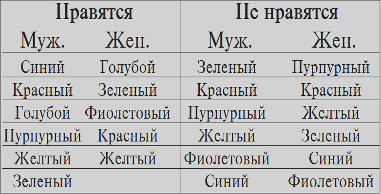 К примеру, известна значительная разница в цветовых предпочтениях мужчин и женщин. В данном случае последовательность от наиболее предпочитаемых цветов к наименее предпочитаемым будет выглядеть следующим образом: