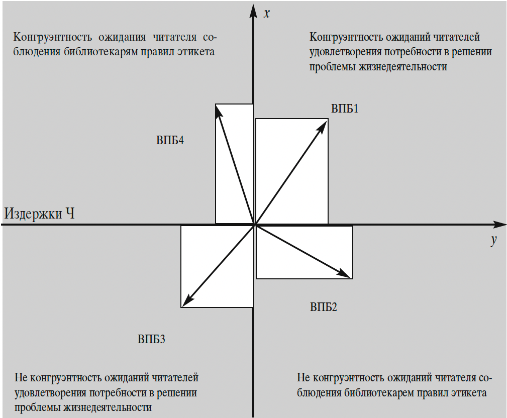 Читатель, идущий в библиотеку уже на подсознательном уровне ожидает, что библиотекари его не обругают, не испортят ему настроение и удовлетворят его потребность в решении той или иной проблемы посредствам библиотечных ресурсов. С помощью рис. 1 попытаемся представить, что происходит с ожиданиями читателя в различных четвертях декартовой прямоугольной системы координат.