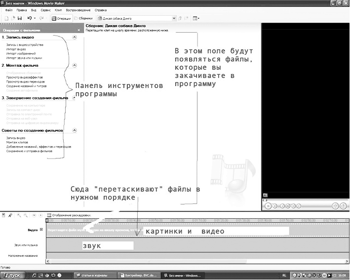 • программы: для звукозаписи (опять же, если вы хотите сами озвучить буктрейлер); для конвертирования видеофайлов в формат avi, если ваша видеоподборка в другом формате (я использую Total Video Converter); для нарезки и склеивания фильмов. Здесь есть выбор, а я пользуюсь простейшей, понятной для «чайников» программой Windows Movie Maker. Она входит в стандартный набор программ практически любого компьютера и имеет очень понятную встроенную инструкцию внутри