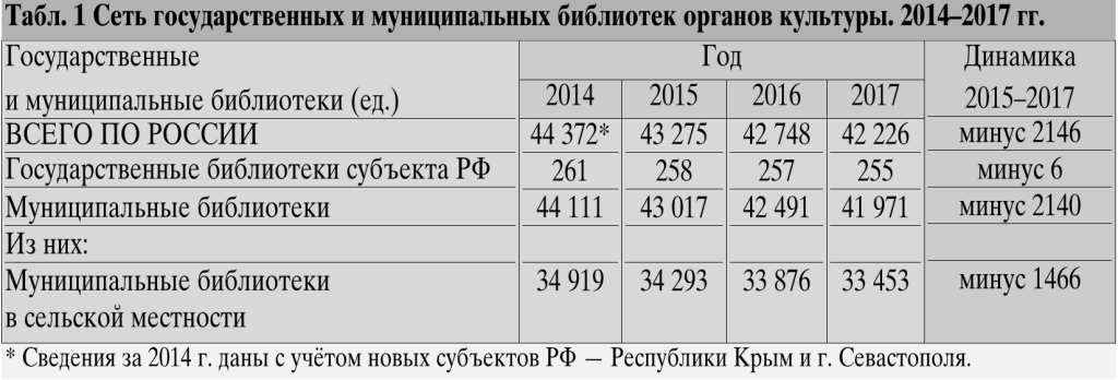 Последний год подарил библиотечному сообществу работу в рамках новых нормативов, утверждённых распоряжением Правительства России 26 января 2017 года. В конце года, 22 декабря, Правительство своим новым распоряжением признало утратившими силу все документы с нормативами в сферах образования, здравоохранения, социальной защиты, физической культуры и спорта, культуры. Страна в одночасье потеряла федеральные ориентиры по организации социально-культурной жизни в стране. Это было сделано без каких-либо объяснений со стороны исполнительной власти, без обсуждения с профессиональным сообществом. Эти изменения ещё предстоит понять и проанализировать, а пока мы подводим итоги трансформаций с учётом данных 2017 года. За точку отсчёта анализа изменений сети за последние три года (2015–2017) принимаем 2014 год. В декабре этого года Указом Президента РФ были утверждены Основы государственной культурной политики, в которых были поставлены задачи по «сохранению сложившейся сети организаций культуры, созданию условий для их развития, освоению ими новых технологий культурной деятельности»1. Три года — достаточный срок для того, чтобы увидеть основные тенденции государственной библиотечной политики в масштабе страны. Её сетевая составляющая, с нашей точки зрения, является определяющей, так как свидетельствует о доступности библиотечных услуг для населения.