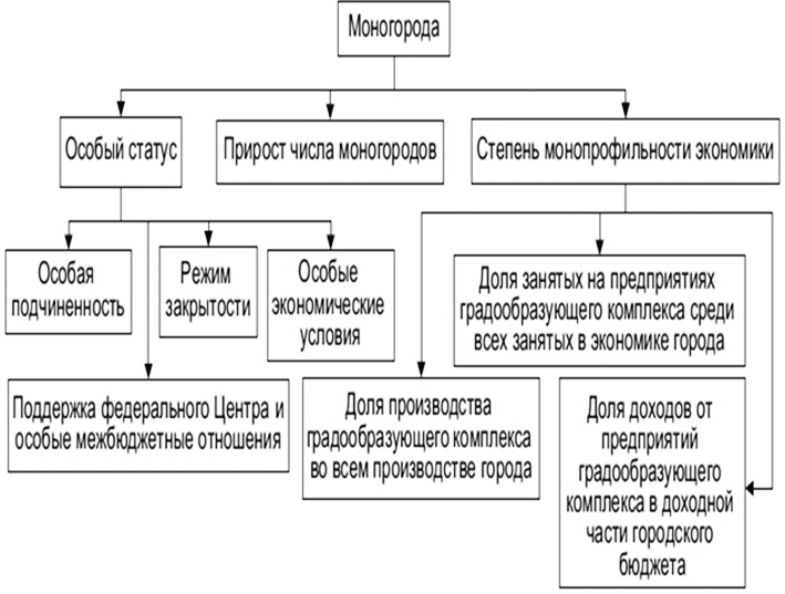 В России насчитывается около 500 моногородов. Жизнь и благополучие их жителей находится в тесной зависимости от одного предприятия, с которого и начиналось строительство этого населённого пункта. Город и предприятие — как сиамские близнецы, у которых общие органы жизнеобеспечения. На предприятии трудится не менее четверти всего населения (а иногда и больше половины), предприятие даёт существенную часть налоговых доходов в муниципальный бюджет, городские же учреждения обеспечивают комфортный быт сотрудников предприятия. Среди градообразующих предприятий есть наукоёмкие производства, относящиеся к сфере оборонной промышленности, поэтому не случайно, что ряд моногородов является закрытыми (ЗАТО).