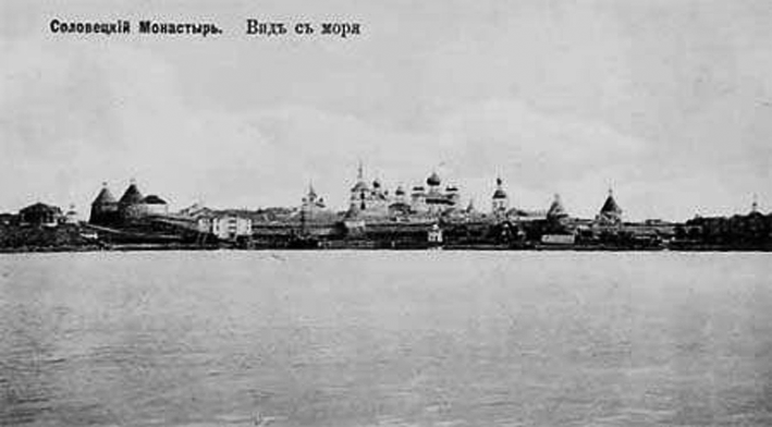 На трёх общих снимках монастырского комплекса видно, что обитель окружена мощными стенами и башнями, построенными в 1582–1594 гг. зодчим Трифоном, монахом Соловецкого монастыря. Над монастырем возвышается величественный пятиглавый Спасо-Преображенский собор (1558–1566) — постройка игумена Филиппа Колычева. Левее видна воздвигнутая в 1777 г. колокольня. Между нею и собором видны ещё два храма — пятиглавая Никольская церковь и одноглавый Троицкий Зосимо-Савватиевский собор, в котором находилась одна из главных святынь монастыря — мощи его основателей. Левее колокольни находится Успенский собор — ещё одна постройка св. Филиппа. В крайнем левом углу, рядом с одной из башен стены, просматривается церковь иконы Божией матери «Утоли моя печали», которая была построена в 1905 г., а в советское время уничтожена. Церковь была наверху опоясана разноцветным живописным фризом, образованным расположенными вплотную друг к другу иконами. Эта деталь позволяет предположить, что фотографии были сделаны не ранее 1905 года.