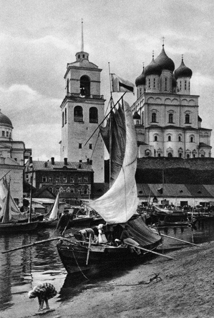 В альбоме мы видим снимок с общим видом Пскова с юго-западной стороны, на первом плане — Троицкий собор, один из главных символов этого города с древних времен. Первый Троицкий храм был построен во второй половине X в. После того, как в 1137–1138 гг. на месте сгоревшего деревянного храма построили каменный собор, он ещё несколько раз переживал пожары и реставрации и был закрыт в 1930-х гг. На двух других снимках запечатлены главные святыни средневекового Пскова, которые хранились в Троицком соборе — мечи святых князей-покровителей Псковской земли Всеволода-Гавриила и Довмонта-Тимофея.