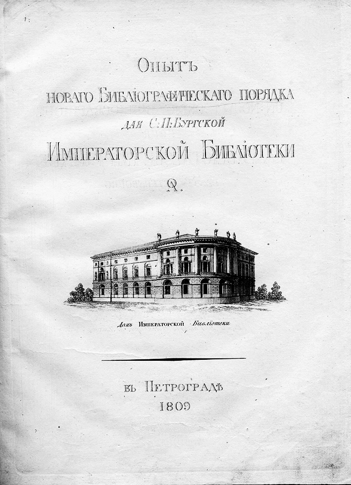 В 1809 г. Оленин издал первое в России руководство по организации фондов и каталогов «Опыт нового библиографического порядка для Санкт-Петербургской Публичной библиотеки», разработал структуру Библиотеки, в 1811 г. собрав книги на русском языке в особом отделении. Организация самостоятельного русского фонда подчёркивала национальный характер Императорской Публичной библиотеки. Выполняя эту возложенную на неё задачу, Библиотека со временем стала и — продолжает оставаться по сей день — крупнейшим в мире хранилищем книг и рукописей на русском языке.