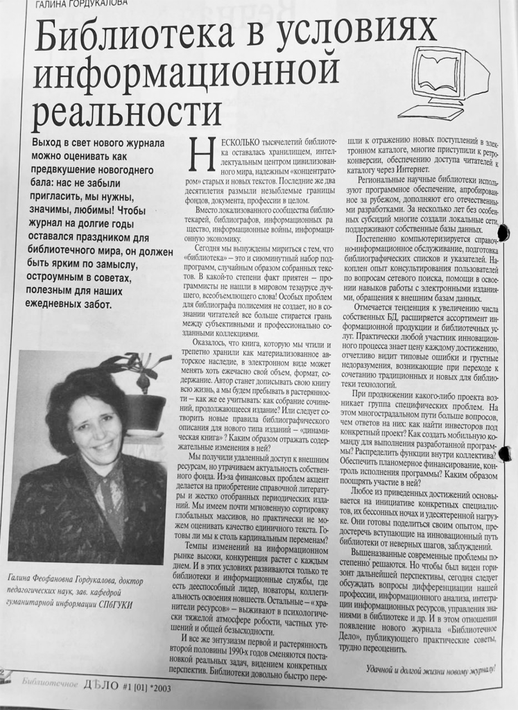Тема настоящей статьи для юбилейного 400-го выпуска журнала «Библиотечное Дело» выбрана неслучайно1. Первый выпуск журнала в 2003 г. открывался статьей Галины Феофановны Гордукаловой (1950–2015), представителя петербургской школы отраслевой библиографии и научно-информационной деятельности.