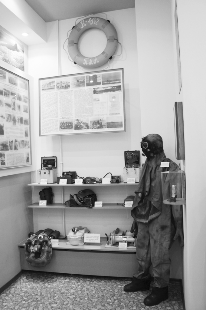Все экс­по­на­ты здесь нас­то­я­щие. Ни­ка­ко­го но­во­де­ла. Все с атом­ных под­вод­ных ло­док — фор­ма, ор­де­на, лич­ные ве­щи. Есть, нап­ри­мер, фор­ма Ива­на Фе­до­ро­ви­ча Мо­ро­зо­ва, ге­роя Со­ве­тс­ко­го Со­ю­за, ка­пи­та­на II ран­га. В нас­то­я­щий мо­мент он ка­пи­тан I ран­га, жив-здо­ров, жи­вет не­да­ле­ко от му­зея и час­то бы­ва­ет здесь. Есть фор­ма обык­но­вен­но­го мат­ро­са ма­лень­ко­го раз­ме­ра, но и слу­жить на под­вод­ных лод­ках при­зы­ва­ют­ся мо­ло­дые лю­ди очень не­боль­шо­го рос­та. Есть да­же па­рад­ная фор­ма контр-ад­ми­ра­ла Ю. Н. Ка­лаш­ни­ко­ва. Предс­тав­ле­на тро­пи­чес­кая фор­ма одеж­ды: яр­ко-го­лу­бо­го цве­та пи­лот­ка, шор­ты, ру­баш­ка с ко­рот­ким ру­ка­вом — в та­кой на­ши под­вод­ни­ки слу­жи­ли на Ку­бе, в Ан­го­ле, Лу­ан­де.