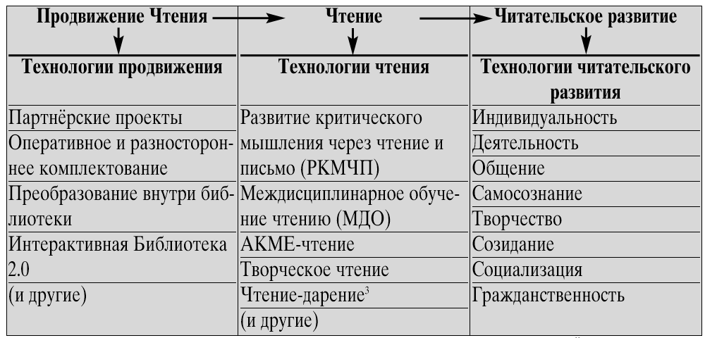 Невольно снова обращаюсь к технологиям. Что такое технология применительно к библиотеке? Вещь в себе? Нечто обоюдоострое? Наука или ремесло?2 Что такое технологии применительно к чтению? Чтение — это ремесло или творчество? Что должно стать результативным продуктом технологии продвижения чтения? Может быть, само чтение? А результатом чтения должно стать читательское развитие личности? В свою очередь, у каждой из этих позиций имеются свои технологические цепочки, которые также должны привести к определённым результатам.