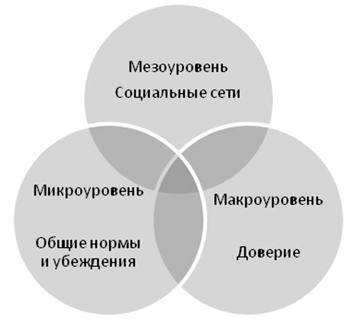Общественные науки сегодня для объяснения влияния культуры на социально-экономическое развитие, часто используют концепцию социального капитала1. Понятие, введённое П. Бурдьё в 1980 г. для обозначения социальных связей, которые могут выступать ресурсом получения выгод, в дальнейшем значительно обогатилось представителями разных наук: социологами, экономистами, политологами и психологами (хотя в авторской концепции социальный капитал рассматривался только как групповой ресурс). Общепринятая в настоящее время структура понятия была предложена Р. Патнэмом и включает, помимо социальных связей, социальные нормы и доверие, которые являются индивидуальным, а не групповым ресурсом. Тем самым социальный капитал пронизывает все уровни социально-экономической системы: макроуровень, микроуровень, мезоуровень (модель структуры социального капитала И. М. Мачеринскене, Р. В. Минкуте-Генриксон, Ж. Й. Симанавичене).