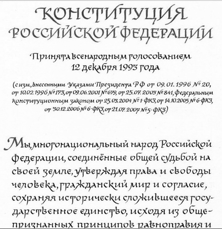 — Давайте поговорим о знаменитом проекте — рукописной Конституции РФ, презентация которой состоялась на Международной выставке каллиграфии и которая будет представлена в ноябре текущего года в «Современном музее каллиграфии» в Москве. Зачем она? Откуда?