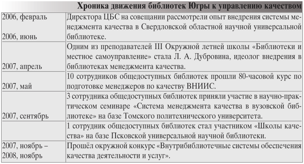Вызовы времени требуют изменения менталитета и поведения библиотек как социальных систем. Участие в конкурсах по качеству, применение методов менеджмента качества в повседневной деятельности библиотек способствует систематическому критическому изучению того, что работает, а что нет, избавляет от привычки фиксировать внимание на отдельных недостатках и помогает увидеть библиотеку как систему, в которой все заинтересованные стороны могут добиваться качественно иных результатов, а не просто работать.