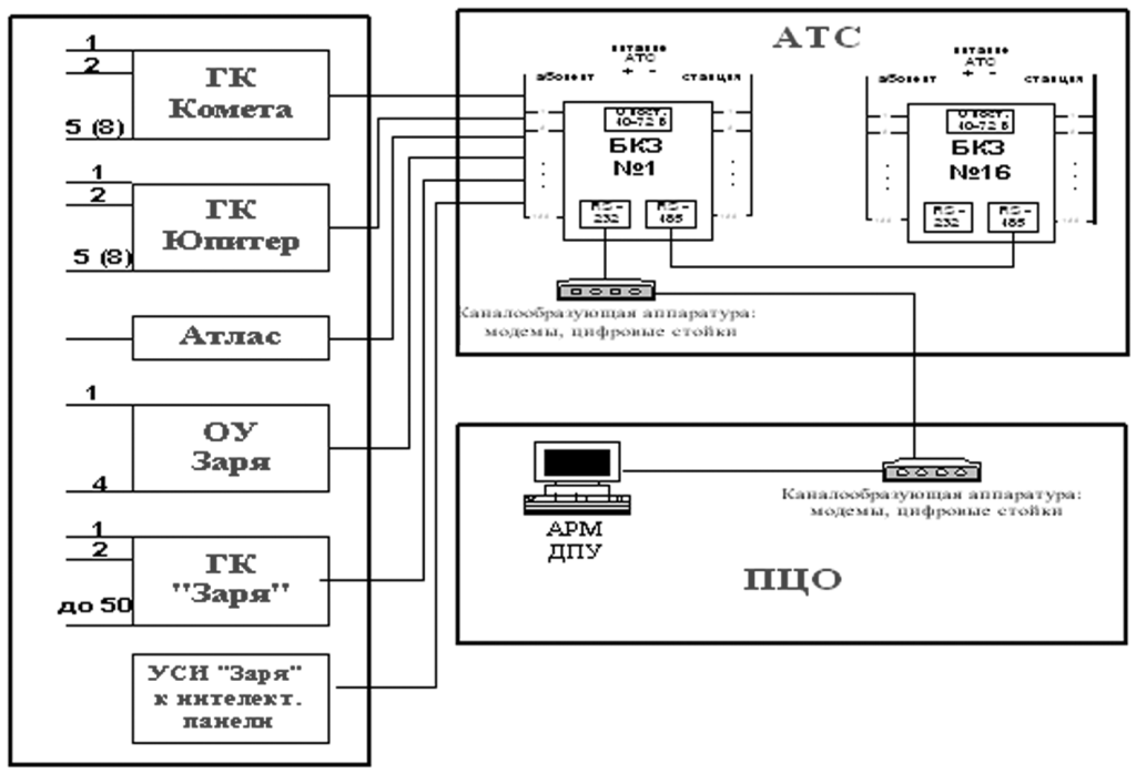 Так, еще в 1995 г. впервые в России специалистами Управления вневедомственной охраны начал разрабатываться автоматизированный программно-аппаратный комплекс «Заря» систем централизованного направления. В настоящее время этот программно-аппаратный комплекс представляет собой набор аппаратных и программных модулей. Учитывая специфику конкретного объекта и выбирая нужные компоненты, можно создать простейшую схему автоматической (без дополнительных звонков на ПЦО) передачи информации с объекта на ПЦО, а можно — компьютеризированную сеть централизованного наблюдения непосредственно на объекте с 10–20 тыс. шлейфов сигнализации. Структурная схема наиболее часто применяемых аппаратных модулей комплекса представлена ниже.