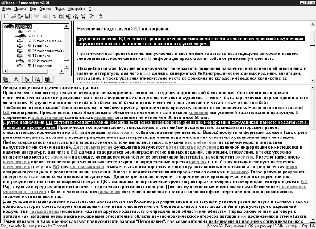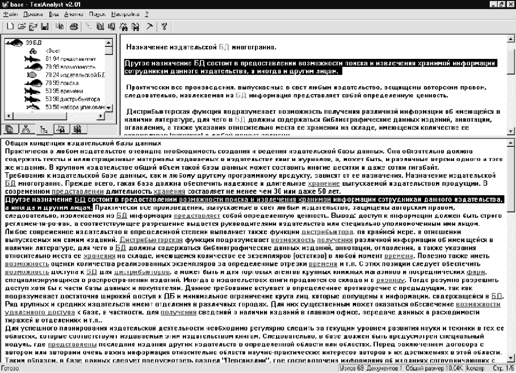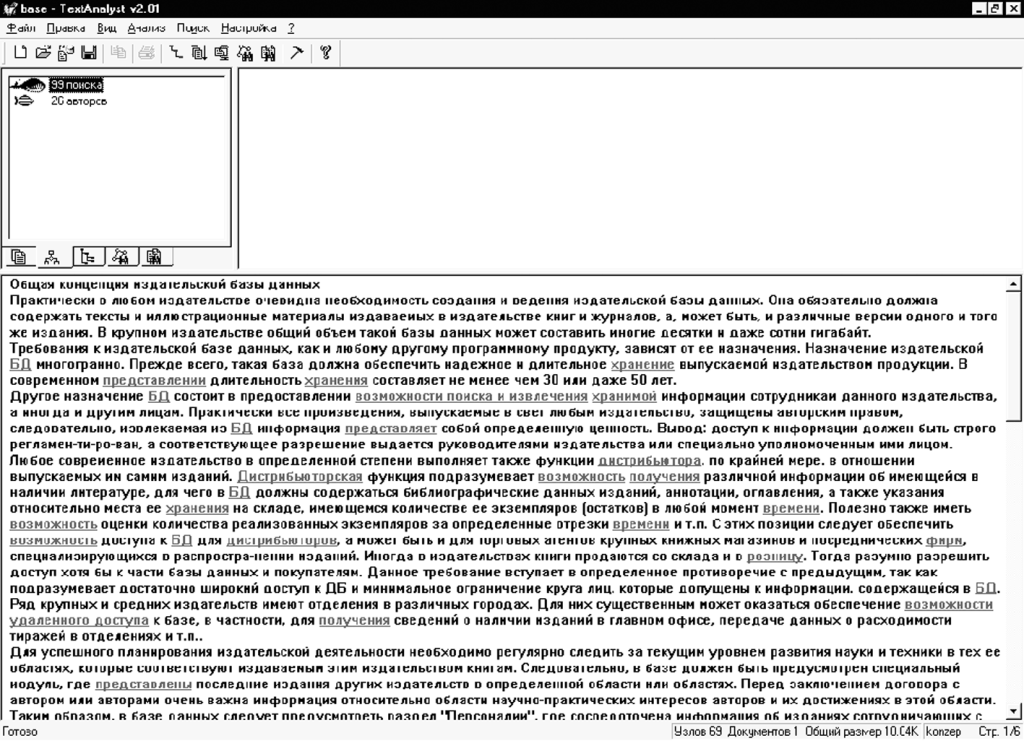 Результаты работы программы TextAnalyst 2.01. представлены на рис. 2 Анализу была подвергнута статья «Общая концепция издательской базы данных». Интерфейс TextAnalyst 2.01 построен в виде трех взаимосвязанных окон: