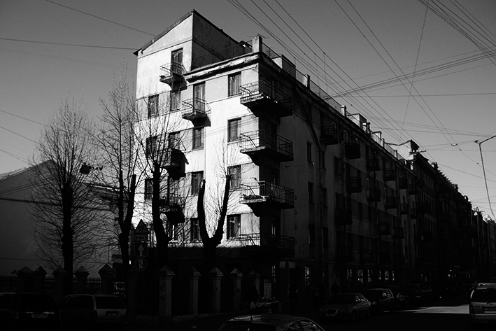 Этот дом на улице Рубинштейна в Петербурге мгновенно бросается в глаза — очень уж неприглядным и обшарпанным выглядит он на фоне красивых, нарядных, щедро декорированных зданий XIX века: голые стены без украшений, крохотные балкончики, строгие геометрические формы… Можно даже сказать, что этот дом напоминает историю молодого советского государства в миниатюре: то же самое несоответствие грандиозного утопического замысла и суровой реальности…