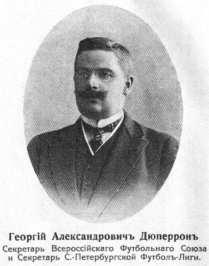 Футбол в России носил характер городских, а иногда и районных замкнутых команд, единой команды не существовало. В 1902 г в России была создана первая в стране Санкт-Петербургская футбол-лига при участии и по инициативе Г. А. Дюперрона, который с 1904 г. стал секретарём Лиги, постепенно объединившей все футбольные и хоккейные команды России13. Первым капитаном футбольной и хоккейной команд России также стал Георгий Александрович Дюперрон. С 1908 г. он — бессменный арбитр футбольных матчей, в том числе и международных. С 1915 г. его избрали председателем Всероссийского футбольного союза, и именно ему принадлежало почётное право регистрации последнего в ФИФА.