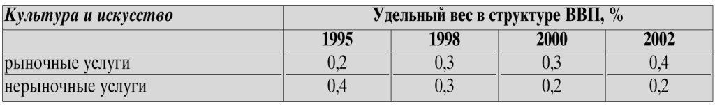 Приведённые данные демонстрируют также, что государство всё больше перекладывает заботу о воспроизводстве человеческого капитала, духовной сферы на население. В 2002 г. доля культуры и искусства в ВВП составила 0,6%, причём 2/3 представляли рыночные услуги (в 1995 г. — 1/3).2