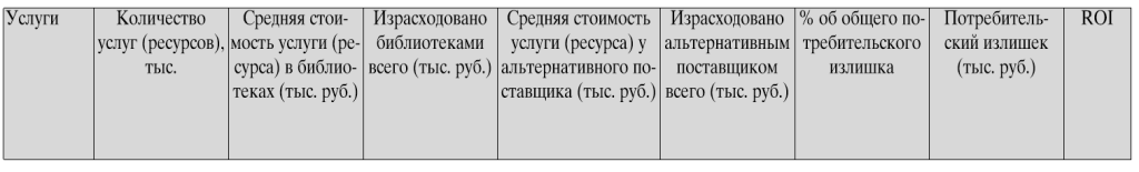 Для получения общих показателей, полученных в целом от деятельности общедоступных библиотек, была составлена матрица, которая позволила дополнительно сравнить эффект, полученный от каждой услуги.