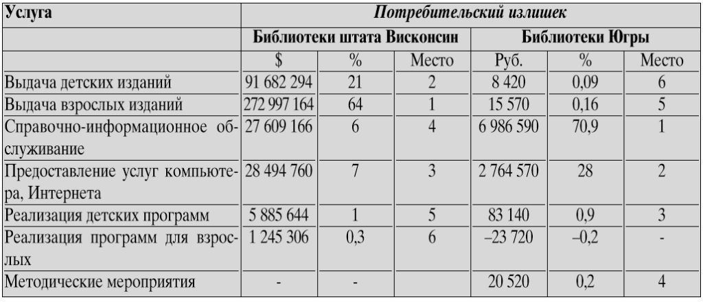 Полный экономический эффект от оказания библиотеками штата Висконсин услуг был получен в размере $427 914, 3 тыс., библиотек Югры — 9 855,1 млн рублей (что вполне сопоставимо). Однако соотношение услуг в общем объёме полученного потребительского излишка у библиотек разное: