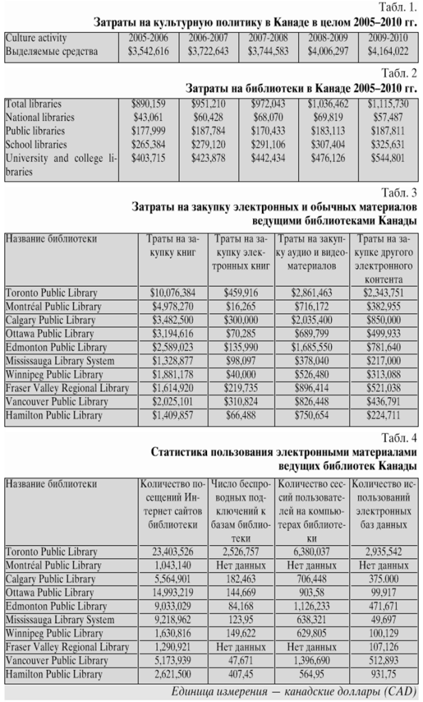 В период с 2005 по 2010 гг., за который нам доступны данные, финансирование культурной сферы Канады в целом выросло с 3 млн 542 тыс. канадских долларов (CAD) до 4 млн 164 тыс. CAD (см. Таблицу 1), при этом финансирование библиотечной отрасли в целом увеличилось за указанный период с 890 тыс. CAD до 1 млн 115 тыс. CAD, составив почти треть национальных расходов на культуру в целом. По объёмам финансирования лидируют школьные и университетские библиотеки. Что касается финансирования библиотек системы высшего образования, то оно является абсолютным приоритетом правительства Канады. В 2010 они получили почти половину всех средств, выделенных на библиотеки (подробнее см. Таблицу 2). Но в ответ на достаточно щедрое финансирование, перед канадскими библиотеками становится вызов — соответствие требованиям современности, превращение в площадку для прогресса и развития. Это подразумевает активную информатизацию и инновационное использование новых технологий.