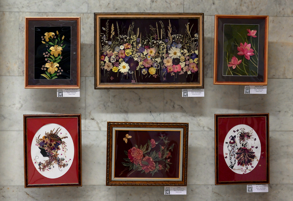 На выставке представлено более 50 картин признанных мастеров плоскостной флористики, выполненных из шелкового лилейника, бархатно-нежной мать-и-мачехи, фактурного ландыша и невесомого тополиного пуха. В подобной технике созданы пейзажи, натюрморты, портреты и коллажные композиции.