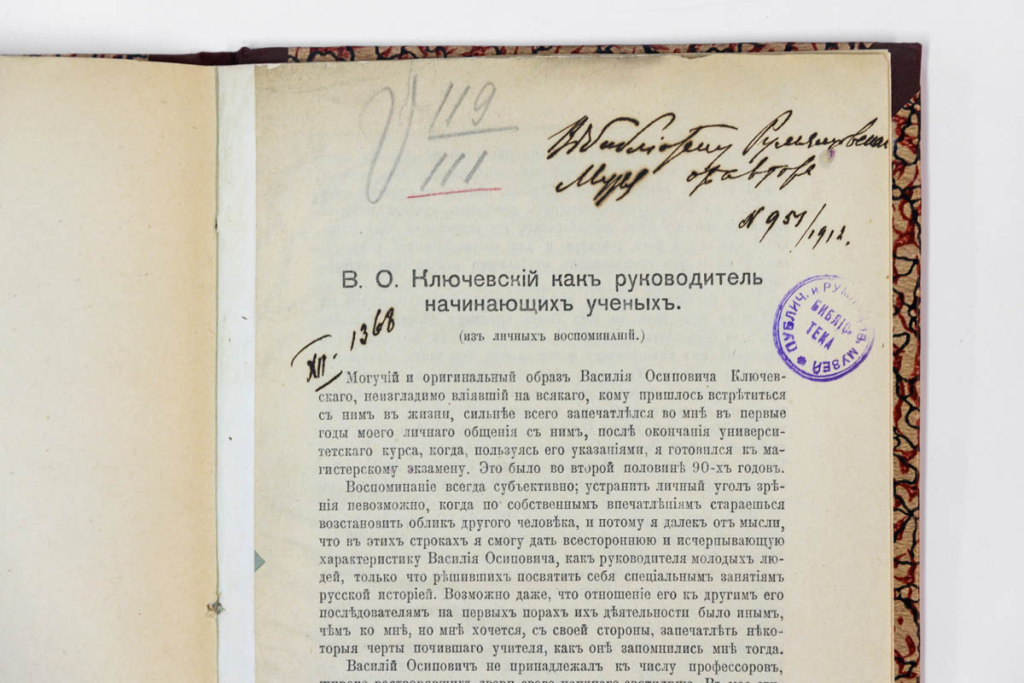 В рамках празднования своего столетия отдел хранения основных фондов Российской государственной библиотеки совместно с экскурсионным бюро 4 и 5 февраля провёл камерные лекции-беседы, приуроченные к 185-летию со дня рождения Василия Осиповича Ключевского (1841–1911) и посвящённые жизни и творчеству выдающегося учёного-историка.