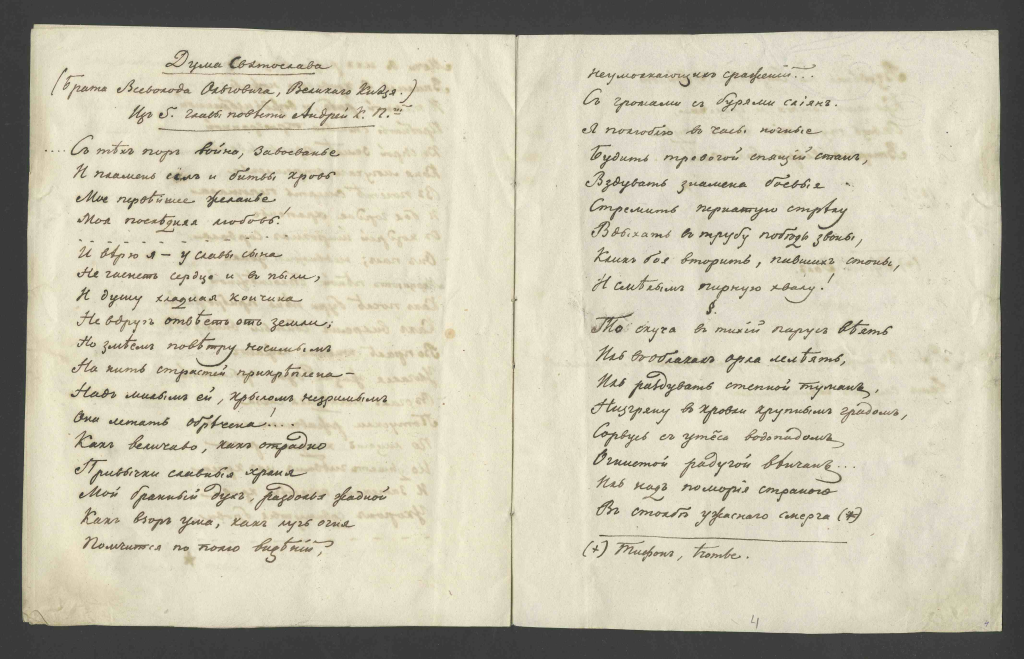 Выставка посвящена архивным материалам — уникальным черновым и беловым автографам и спискам литературных произведений поэтов и писателей декабристского круга Федора Глинки, Александра Бестужева-Марлинского, Вильгельма Кюхельбекера и Александра Одоевского, хранящимся в Отделе рукописей РНБ.