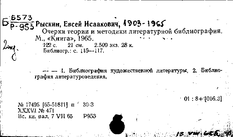 ‼* Рыскин, Е. И. Очерки теории и методики литературной библиографии / Е. И. Рыскин. – Москва : Книга, 1965. – 122 с. – Библиогр.: с. 115-117.
