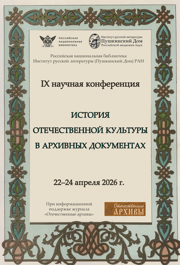22–24 апреля в Главном здании Российской национальной библиотеки состоится IX научная конференция «История отечественной культуры в архивных документах».